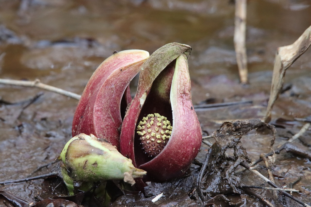 平岡公園の湿地ではミズバショウなど早春の花が開花を始めています。